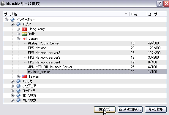 起動したら、「mylines_server」を選択して「接続(C)」を押す。